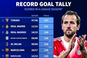 五大联赛单赛季进球榜:拜仁109球第12 都灵123球、皇马121球前二